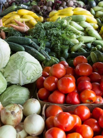 Wide variety of seasonal produce including citrus fruits, tropical fruits, and fresh vegetables.